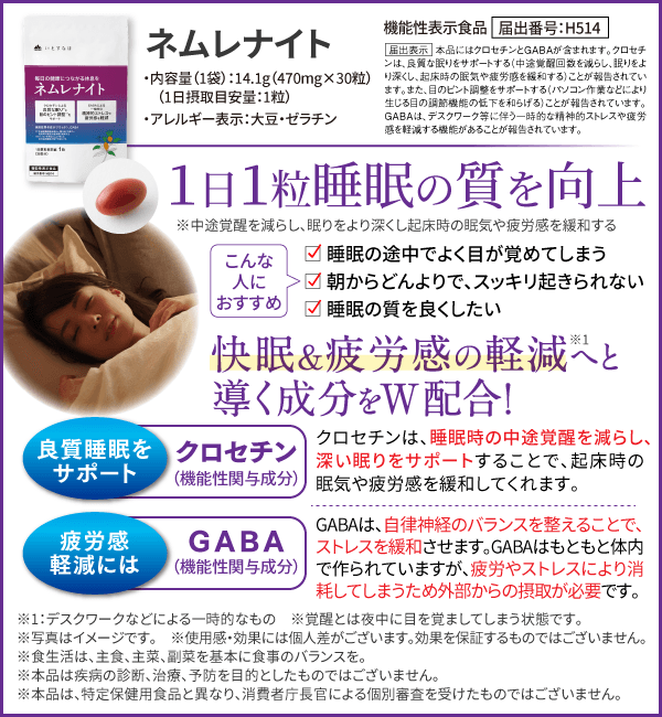 <セット内容> ネムレナイト内容量/30日分 14.1g(470mgx30粒)(1日摂取目安量:1粒)