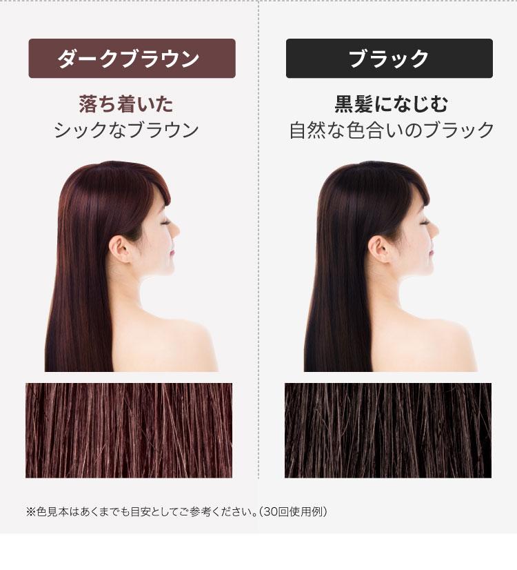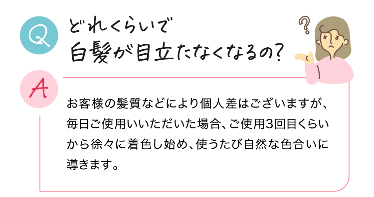 どれくらいで白髪が目立たなくなるの? お客様の髪質などにより個人差はございますが、毎日ご使用いいただいた場合、ご使用3回目くらいから徐々に着色し始め、使うたび自然な色合いに導きます。