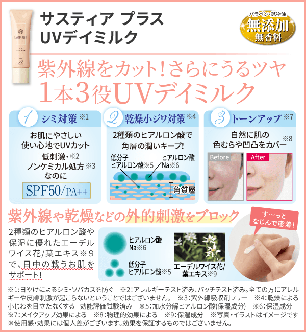 <内容量> サスティア プラス UVデイミルク/30g(約1~1.5ヵ月分※4)商品詳細はこちら