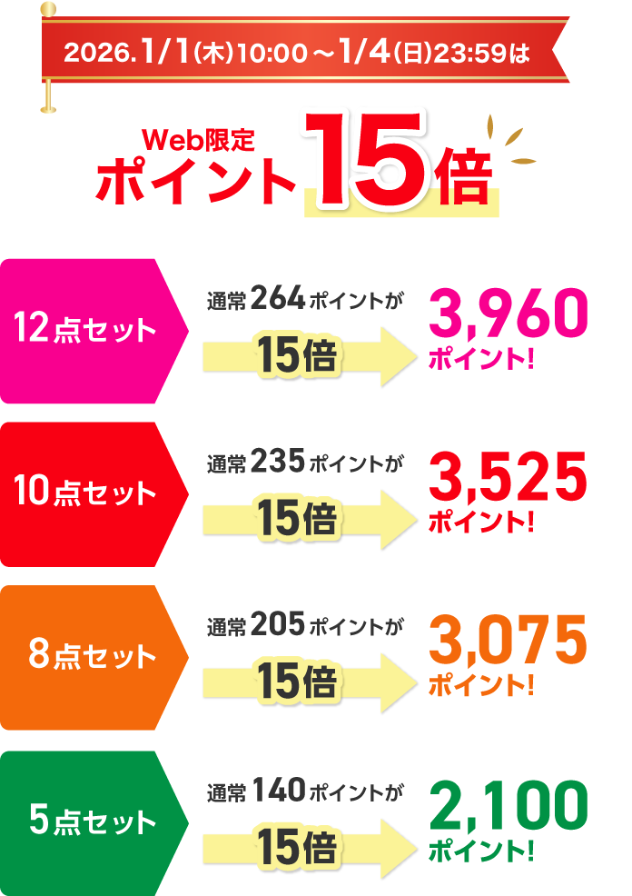 ・ポイント15倍キャンペーンは2026年1月1日(木)10:00~2026年1月4日(日)23:59までの開催です。