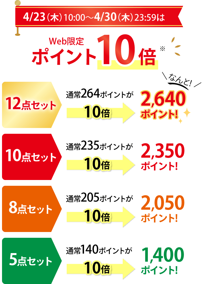 - ※バイキング10点以上の購入特典のポイントは、お届け月の翌月中旬以降に順次付与いたします。