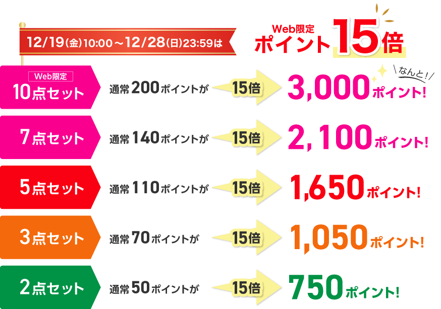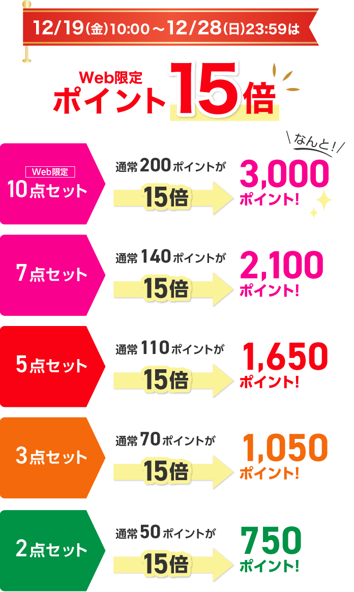 ・通常、ご購入金額(割引後・税込・送料別)100円につき1ポイントが、10倍になるキャンペーンです。(Webでは通常時でも2倍)ポイントは実際のお支払い額に対して付与されます。割引の適用により記載のポイントは変動する場合がございます。定期おトク便・お電話・ご郵送・FAXでのご注文は対象外となります。